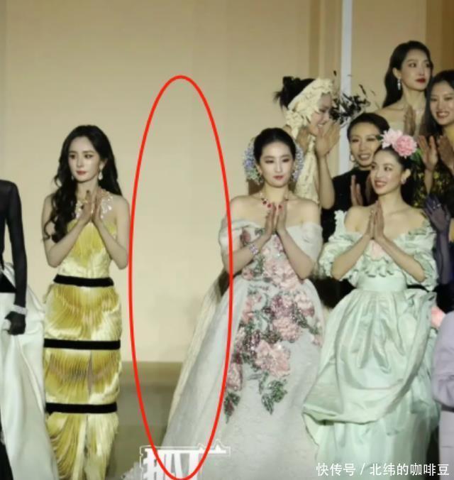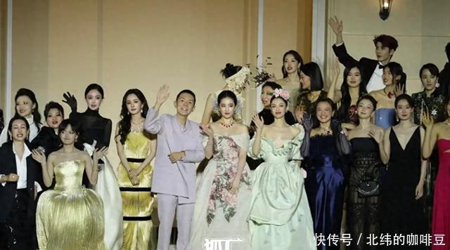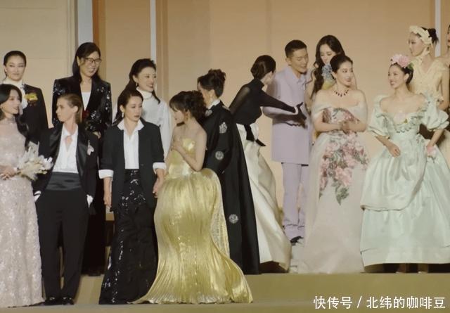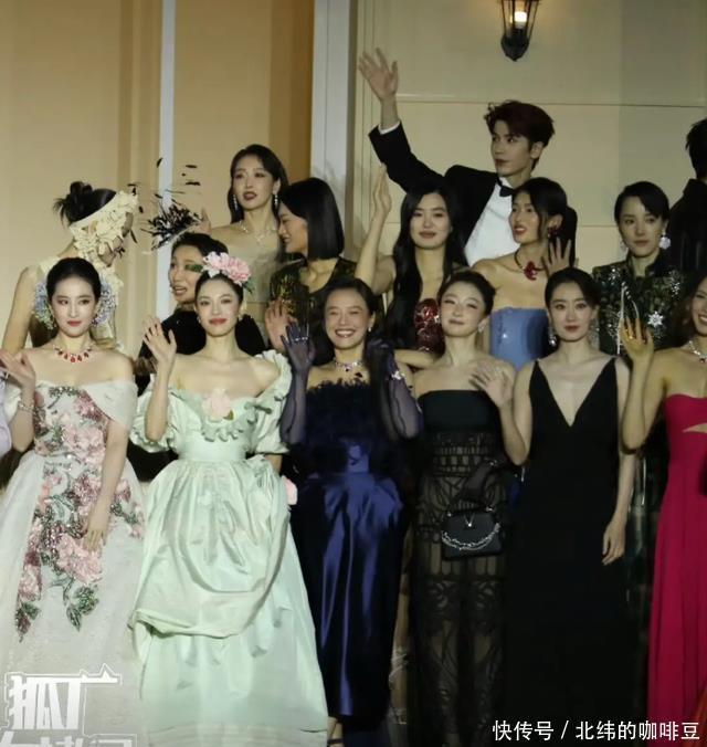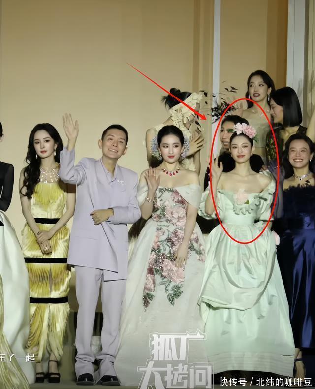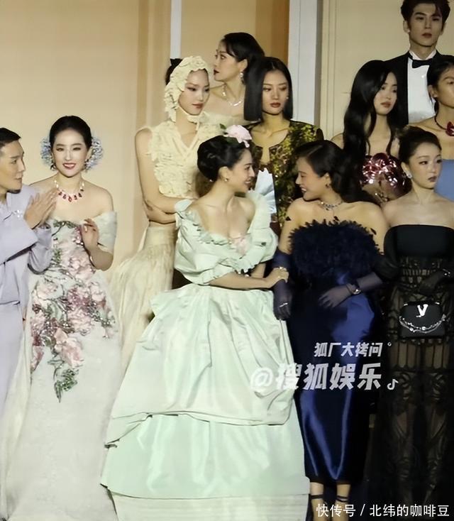 争议最大的来了!钟楚曦站在刘亦菲右边,身后紧跟着周冬雨、马思纯、张小斐三位影后,形成"一姐带三影后"的神奇阵型。 穿1987年NinaRicci古董高定的她,薄荷绿裙摆铺开占了两个人的位置,有视频拍到她和马思纯咬耳朵时。
